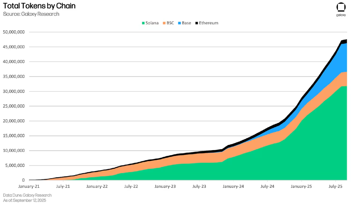 Solana now hosts more than 32 million tokens. Before Pump.fun launched in January 2024, it had fewer than 8 million. That’s 300%+ growth in under two years. Throughput and low fees made Solana the meme factory floor.
