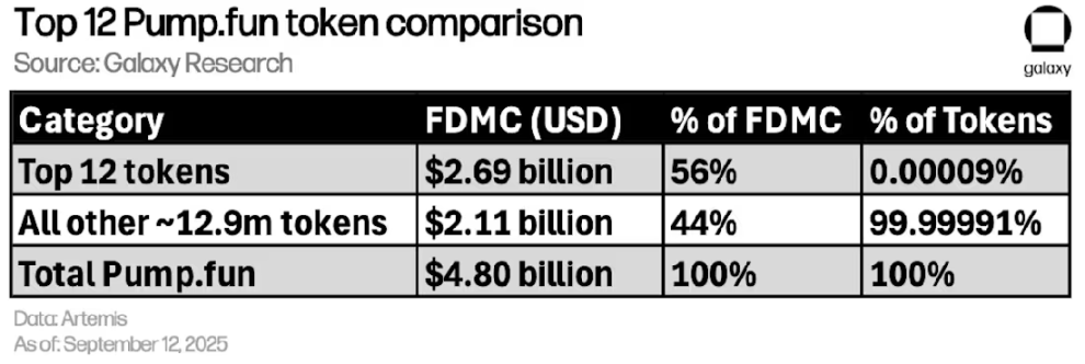 Concentration is brutal. Out of roughly 12.9 million Pump.fun tokens, just 12 capture 56% of the platform’s $4.8B FDMC. That’s 0.00009% of names holding most of the value. A power law with fangs.