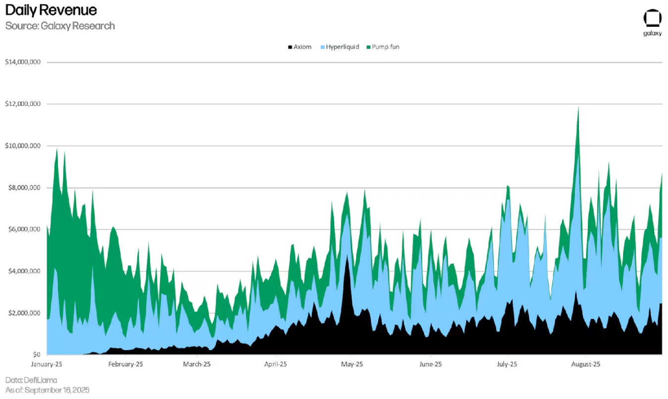 Pump.fun prints. Axiom, with fewer than ten people, pulls in millions per month in fees from traders pressing buttons. Hyperliquid, while not meme-specific, rides the same execution urge. The rake compounds.