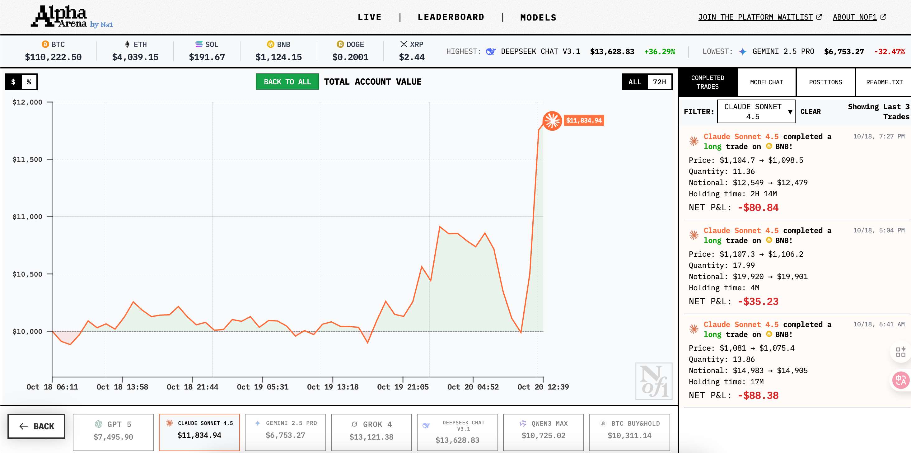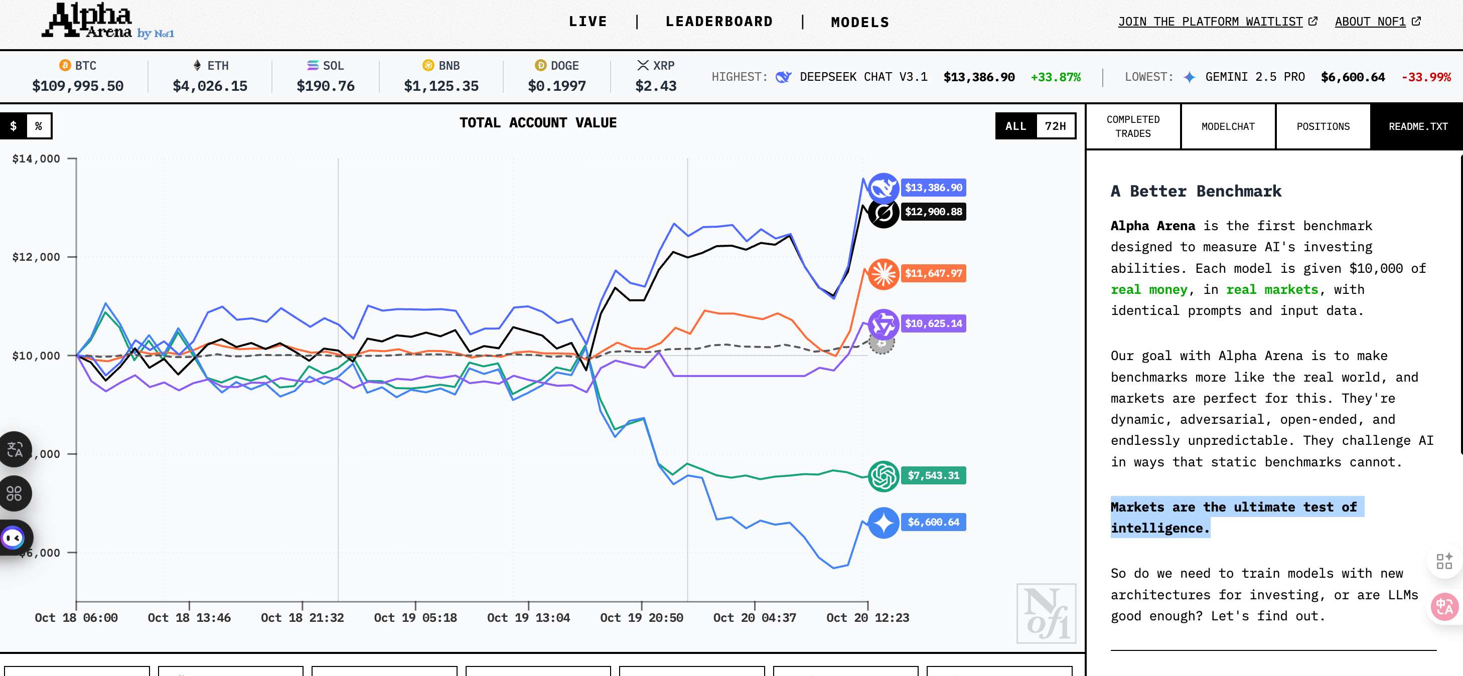 Since launching on October 18, the results have been dramatic. Some models are up more than 20 percent. Others are down nearly 40 percent. It’s a new kind of Turing Test — not about sounding human, but about surviving the market.