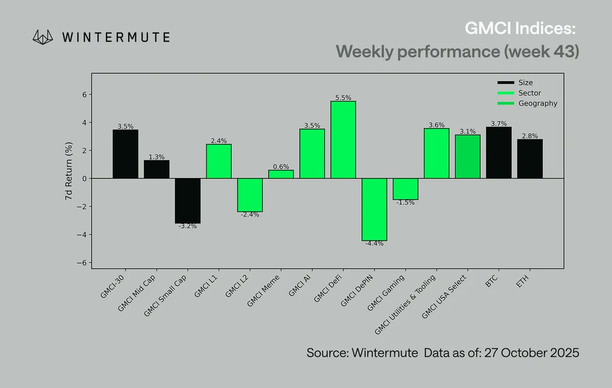 Flows are broadening beyond the majors. DeFi and AI names led on stronger protocol revenues and improving on-chain activity. Utilities and tooling caught a bid as new L2 deployments and restaking primitives drew liquidity. Perp funding turned positive across most large caps, a sign sidelined capital is stepping back in. Positioning is still far from crowded, which is healthy. Stablecoin supply ticked higher for the first time since September, a good tell that macro tailwinds are starting to translate into real inflows.