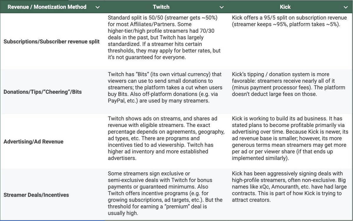 The old model is heavy and slow. Twitch, owned by Amazon, takes 50 percent of every subscription. A mid-tier creator with 1,000 concurrent viewers may earn about 600 a month after subs, ads, and tips. Kick flips the split to 95 and 5. Some streamers can clear more than 6,000 a month with the same audience. That is nearly ten times Twitch. But Kick’s economics ride on subsidy from Stake, its gambling backer. It does not stand on its own.
