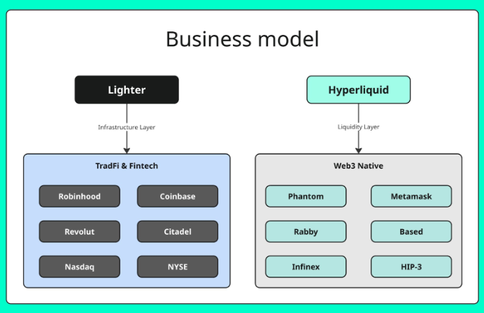Hyperliquid is a B2C play; it monetizes retail trading fees and community vibes. Lighter is a B2B2C play. It is designing decentralized trading infrastructure to plug into fintech apps, brokers, and market makers.