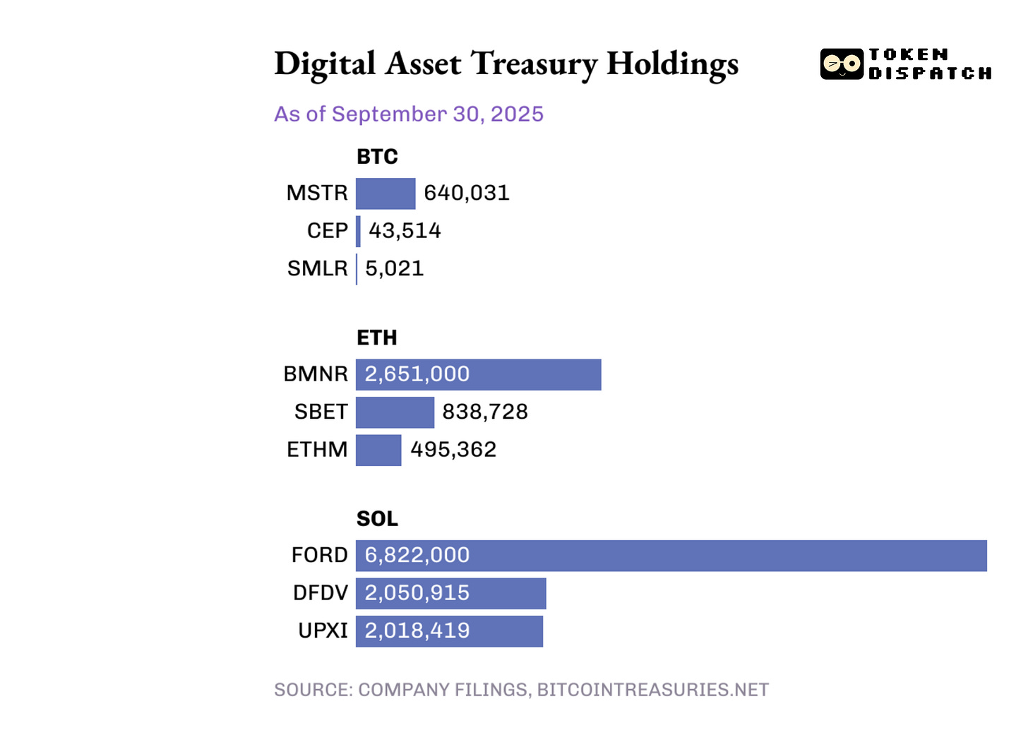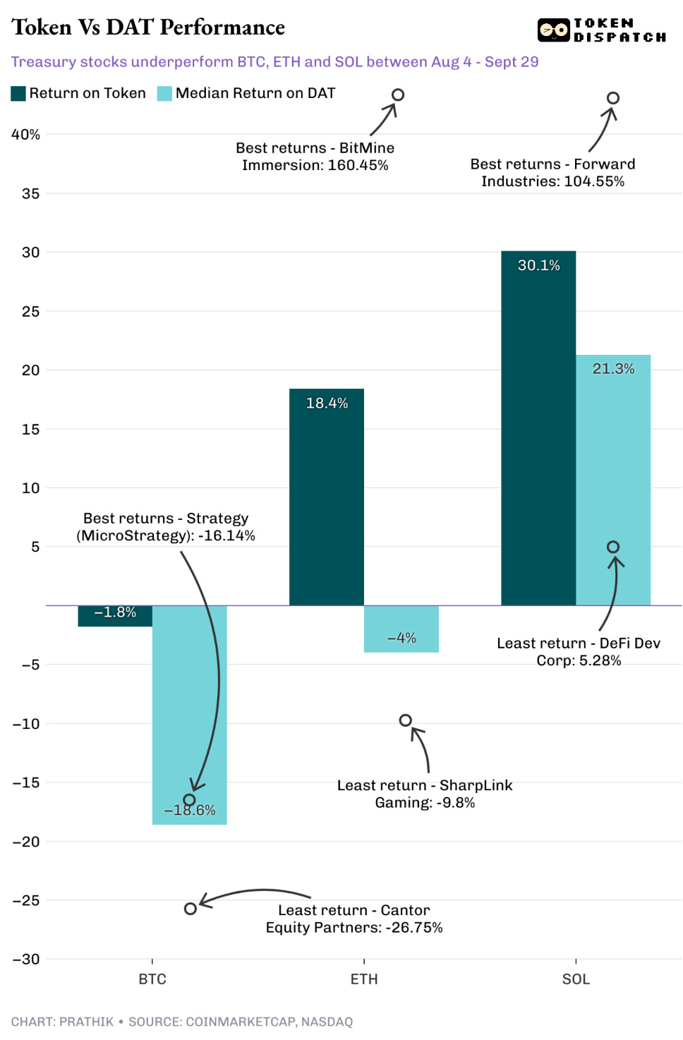 Everybody wants a treasury. Companies rebrand as Digital-Asset Treasuries, promise clean crypto exposure, and tell shareholders to watch “coin per share.” The story sells. The tape disagrees. Over the past two months, across Bitcoin, Ethereum, and Solana, the median DAT stock of the top three treasuries has underperformed its underlying coin. Prices for many of these equities still sit far below their peaks. That turns a cute narrative into a structural problem. The equity wrapper is not delivering token beta like it used to.
