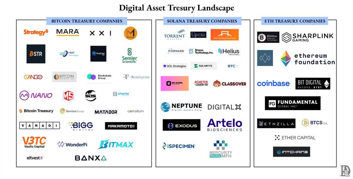 When markets rise, treasury firms trade at a premium above their net asset value. Investors pay extra for a compliant way to gain Bitcoin or Ethereum exposure. With that premium, companies issue new shares, raise more cash, buy more crypto, and push their asset base higher. It’s a reflexive feedback loop — price up, raise money, buy more, repeat.