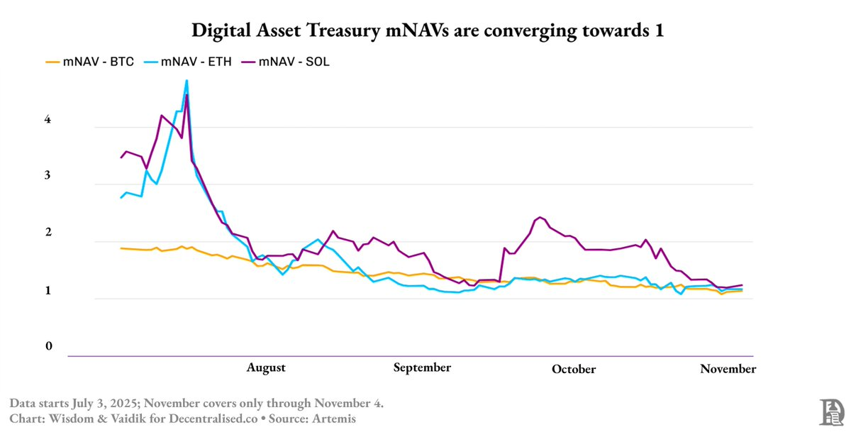 By mid-2025, the loop collapsed. Bitcoin treasury premiums dropped from 1.9× to 1.3×. Ethereum and Solana reserves fell even harder — from 4.8× to around 1.3× in just two months.