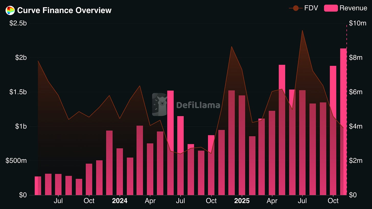 Curve Finance has delivered steady, consistent revenue growth over the past three years even while its fully diluted valuation has fallen. The result is an FDV that sits below eight times Curve’s annualized revenue from the past month. Because of bribes to locked Curve stakers and a long release schedule, the effective yield to token holders is even higher. The key question now is whether Curve can maintain that revenue in coming months.