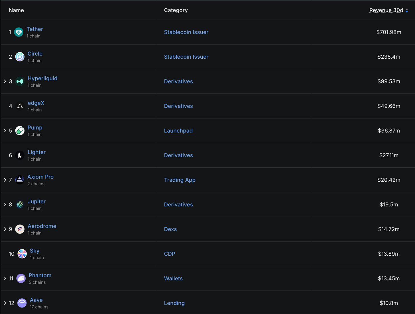 A quick look at the top protocols by 30-day revenue shows a clear pattern. Stablecoin issuers and derivatives platforms dominate. Launchpads, trading apps, CDPs, wallets, DEXs and lending protocols also show up, but the big money clusters where you would expect it.