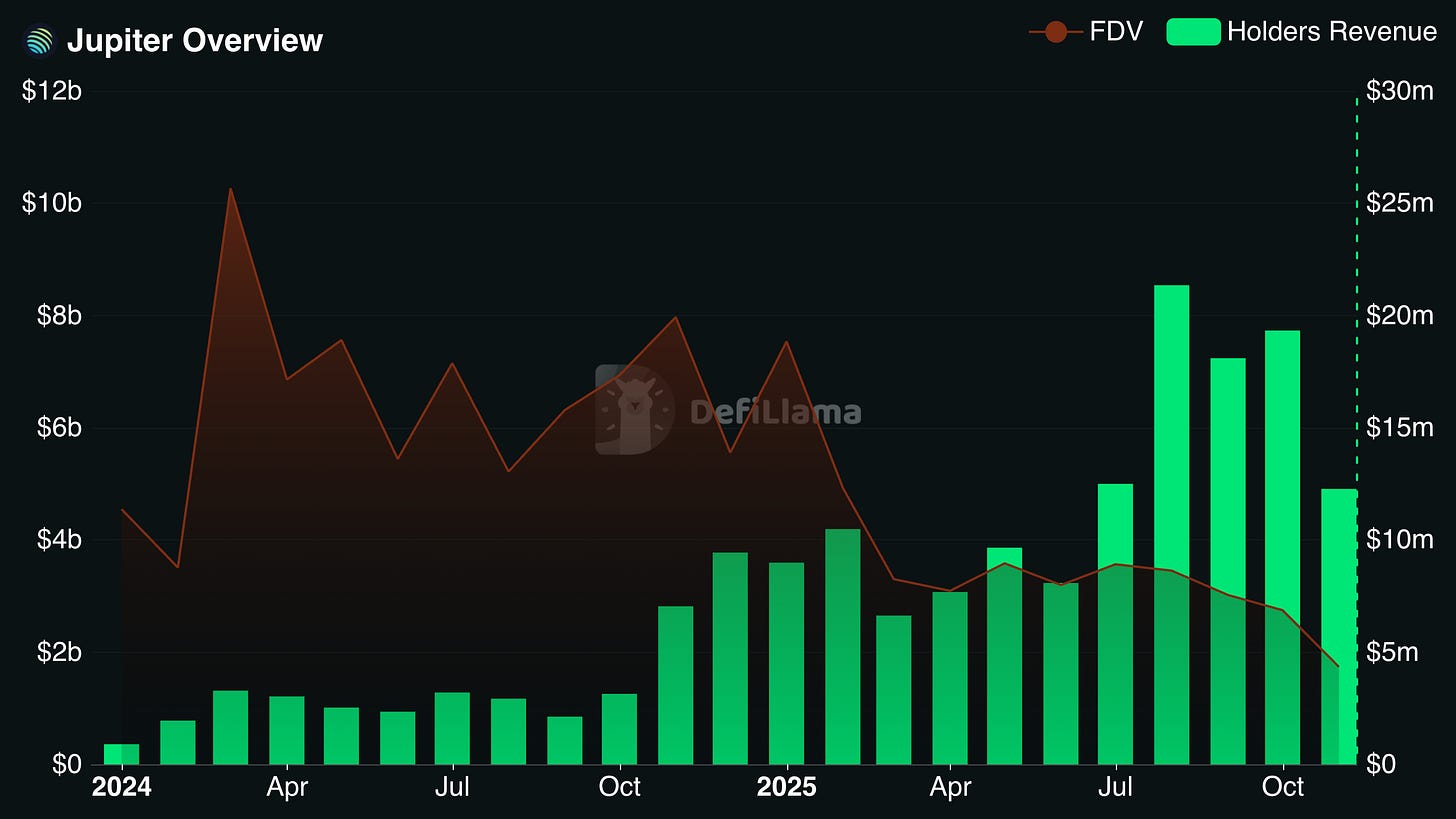 Jupiter is another case. It has become one of the big winners of the Solana ecosystem boom. It is the most used DEX aggregator and perp DEX on that chain. The team has also made strategic acquisitions so they can use their distribution muscle to expand into other onchain markets. According to Scott, annualized revenue that flows to token holders is close to 25 percent of circulating market cap and more than 10 percent of FDV.