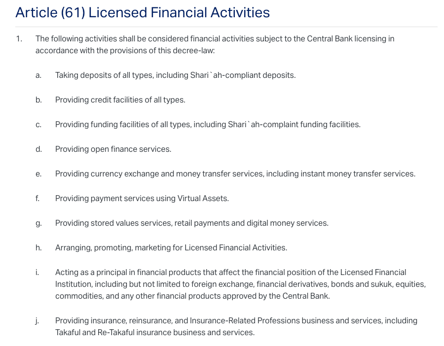 The UAE’s Federal Decree Law No. 6 of 2025 has been in effect since mid September. It is a central bank law that regulates financial institutions, insurance activity, and digital asset services. Articles 61 and 62 outline a broad set of activities that require a license from the Central Bank of the UAE. Crypto payments. Digital stored value. Anything conducted by “any means, medium, or technology.”