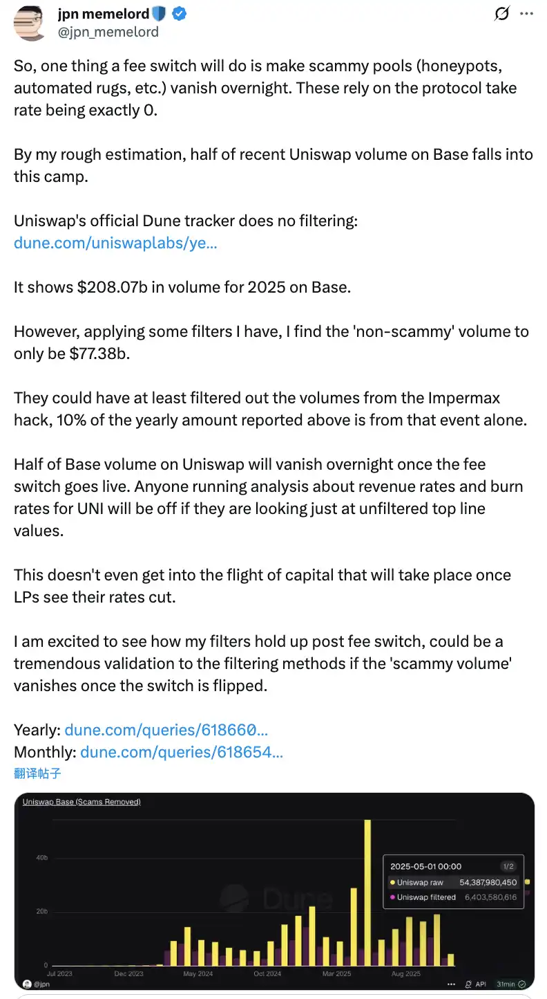 Financially, the math looks strong. Community member Wajahat Mughal estimates Uniswap V2 and V3 together have already generated 114 million if switched on. Including Base, UniswapX, and V4 expansion, that could top $130 million annually.