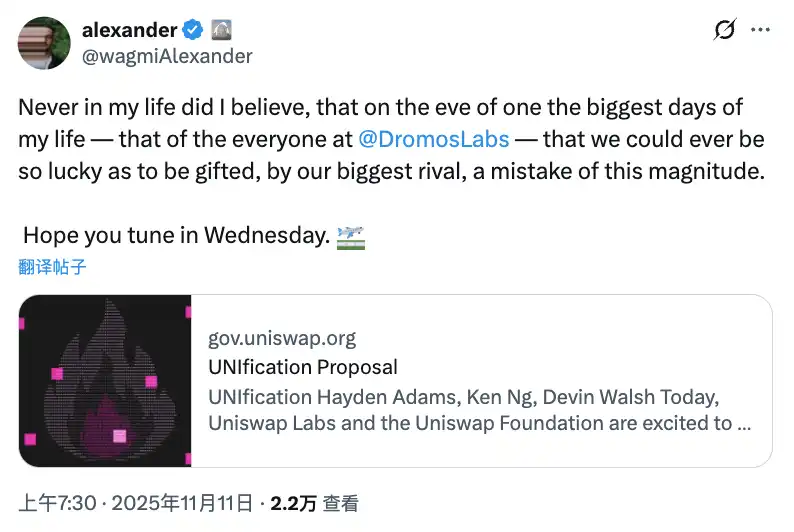 Aerodrome’s CEO Alexander at Dromos Labs mocked Uniswap on X, saying, “I never imagined our biggest rival would hand us such a gift on our biggest launch day.”