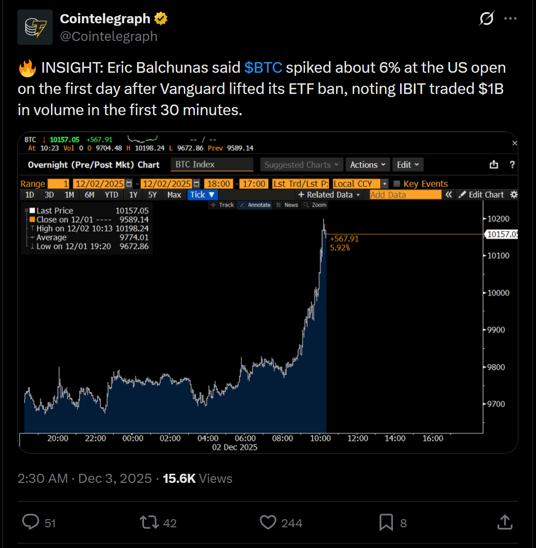 Vanguard is the world’s second biggest asset manager, with roughly 11 trillion dollars under management and more than 50 million brokerage clients. Until now, that enormous base could not buy spot Bitcoin ETFs or other crypto funds through the same login they use for index funds and Treasuries. BlackRock and others feasted on demand while Vanguard told its investors to sit this one out.