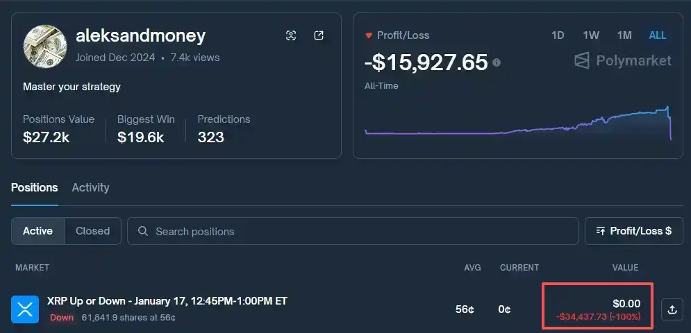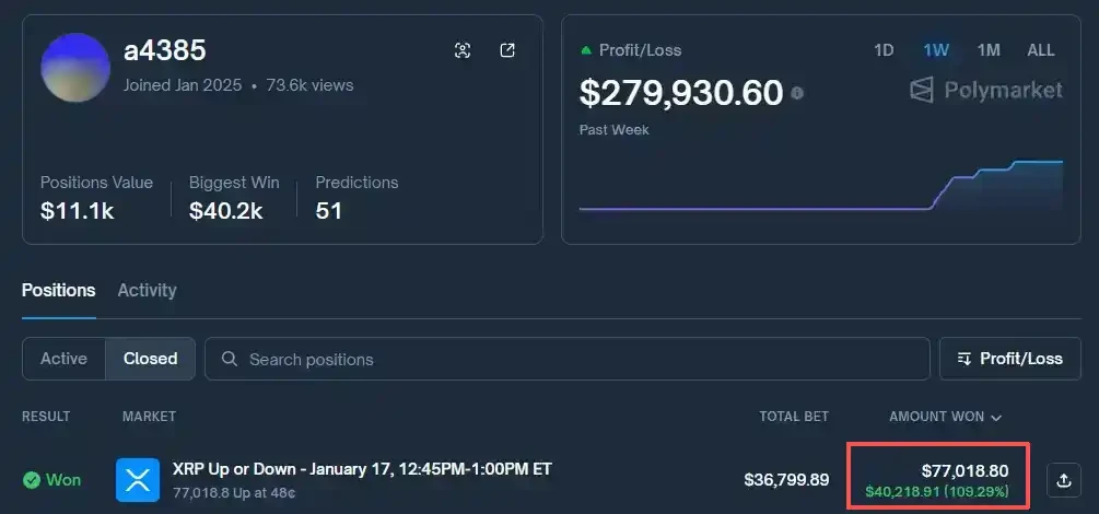 On January 17, a4385 loaded up on "Bullish" bets for XRP in a 15-minute prediction market.