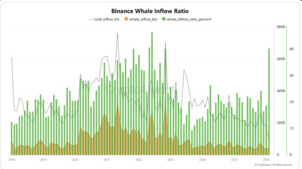 Smart money didn't wait for the news. Binance saw a massive inflow of 78,500 BTC in early February, with whales accounting for 48.5% of that volume. The Exchange Whale Ratio spiked to 0.447, a metric historically signaling distribution.