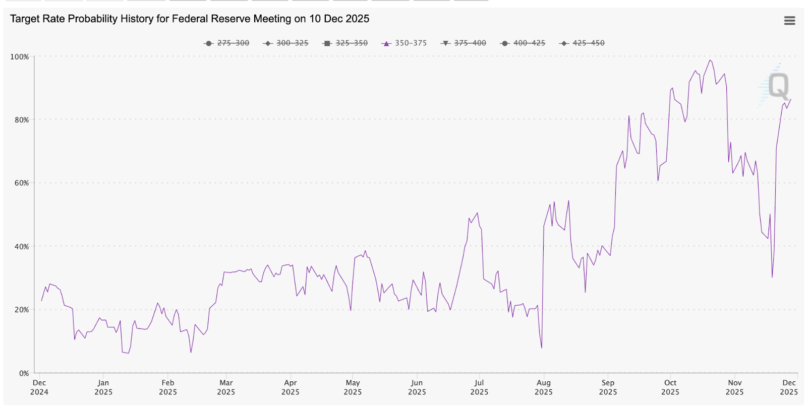 What makes this leg lower so uncomfortable is the backdrop. Core PPI has slipped to 2.6 percent, below expectations. Labor data after the US government shutdown points to a cooling economy. December rate-cut odds, which had collapsed from near-certainty to roughly a third, have jumped back toward a strong probability. Equities noticed and ripped into month-end. Crypto did not. It bled into strength.